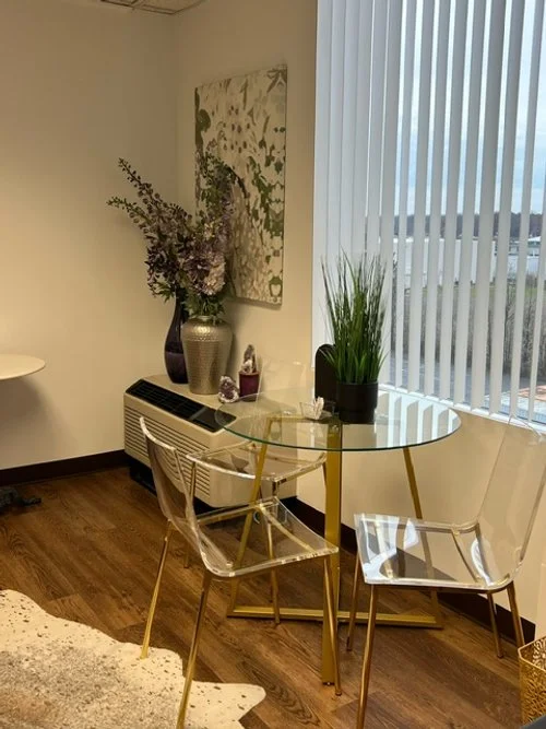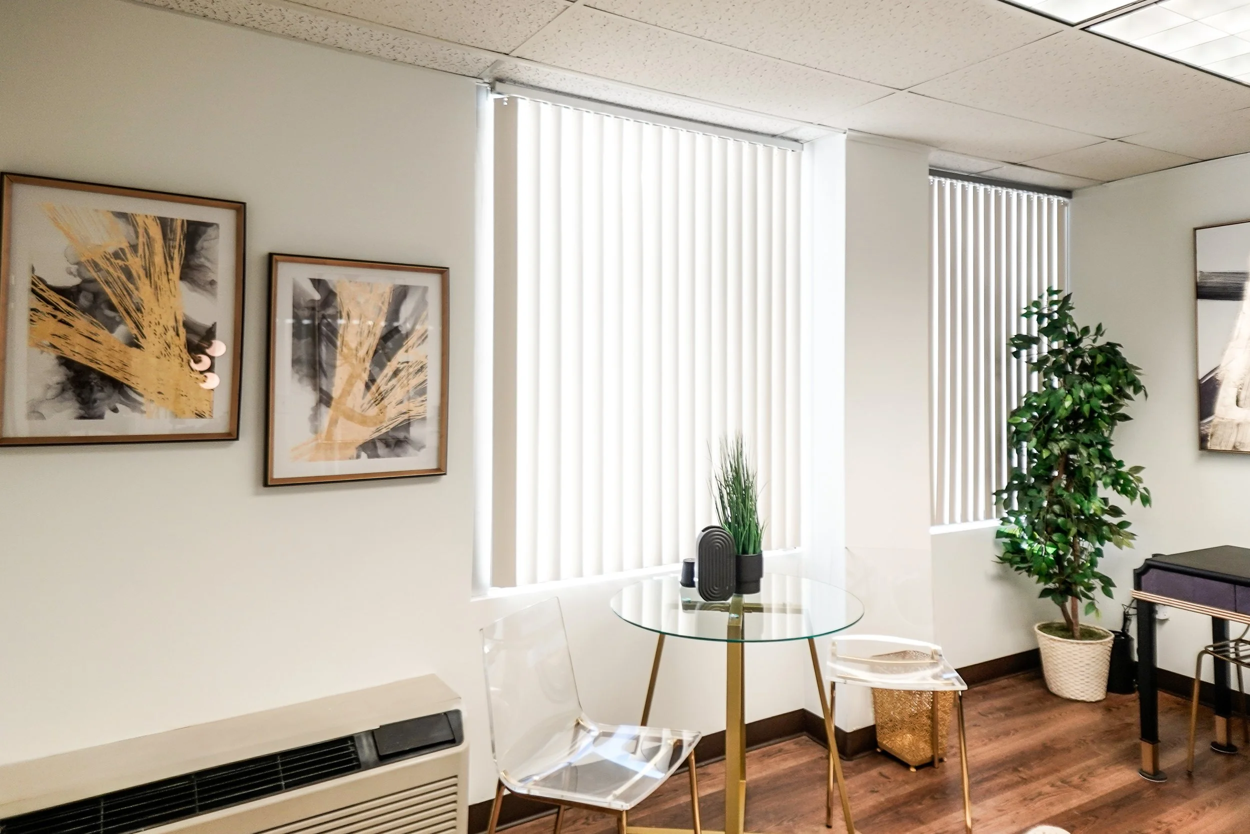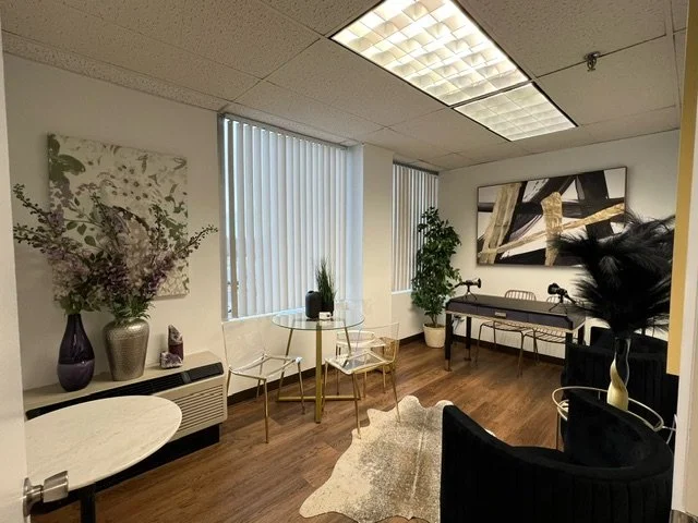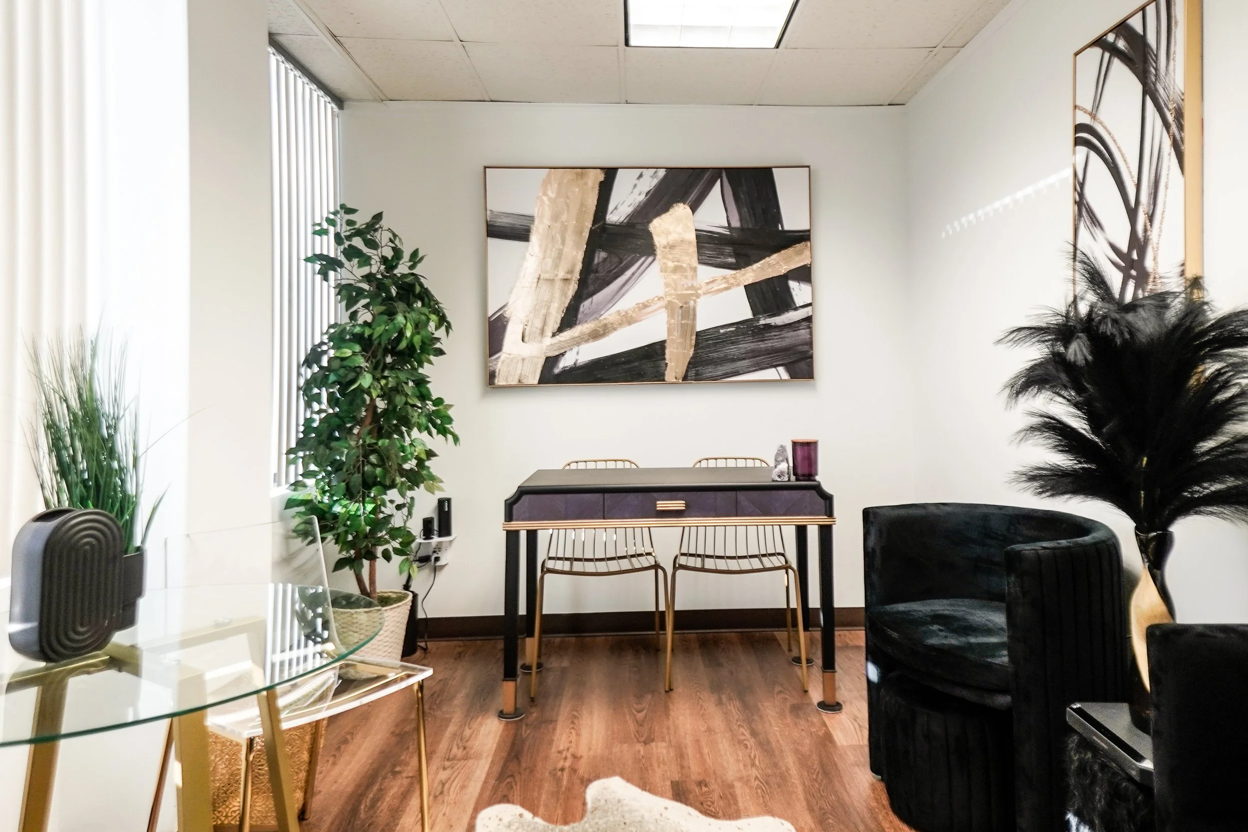 Stepping into the lifestyle room, one is greeted by a harmonious blend of modern sophistication and timeless elegance with a black mid-century modern desk that stands as a testament to both style and functionality, offering a versatile workspace for creatives of all stripes. Sleek acrylic and gold metal furnishings harmonize effortlessly with black and gold wall art, creating a visual symphony that captivates the senses. Against this backdrop of refined luxury, the room radiates a sense of warmth and invitation, encouraging creators to unleash their imaginations and explore the boundless possibilities that lie before them.